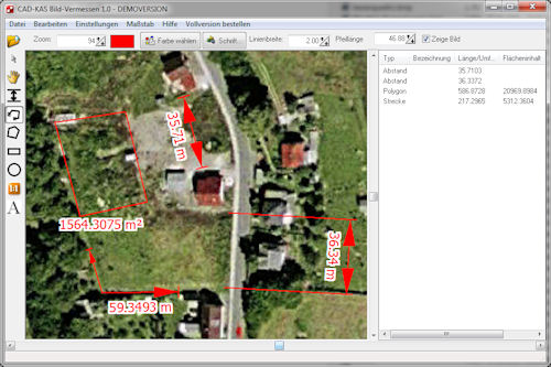Sie können zunächst einen Maßstab festlegen, indem Sie eine bekannte Streckenlänge angeben. Sie können nun Abstände oder die Gesamtlänge einer verwinkelten Strecke messen. Ebenso lässt sich der Flächeninhalt und Umfang eines Vielecks, eines Rechtecks, eines Kreis bzw. einer Ellipse ermitteln.
