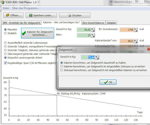 Sie können auch einstellen wie viele Kalorien Sie essen wollen und das Programm stellt Ihre voraussichtliche Gewichtsentwicklung über einen eingestellten Zeitraum grafisch dar. Sie können so Ihre Gewichtsentwicklung für unterschiedliche Kalorienaufnahmen simulieren.